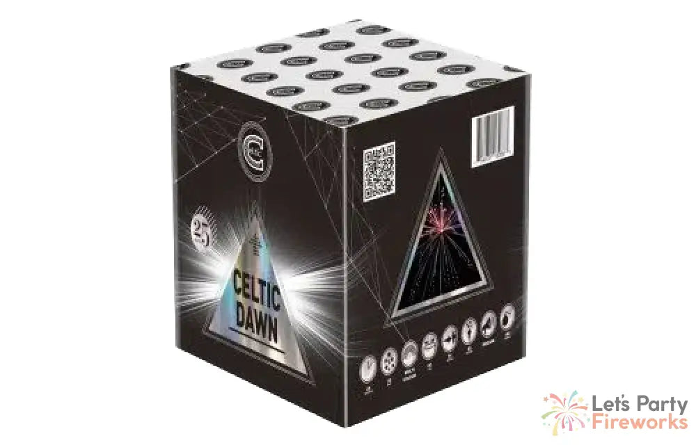 Another great small barrage from Celtic fireworks this fires 25 shots of purple tails to purple chrysanthemum and aqua green tails to aqua green chrysanthemum each with a gold strobe, ideal for any garden party.