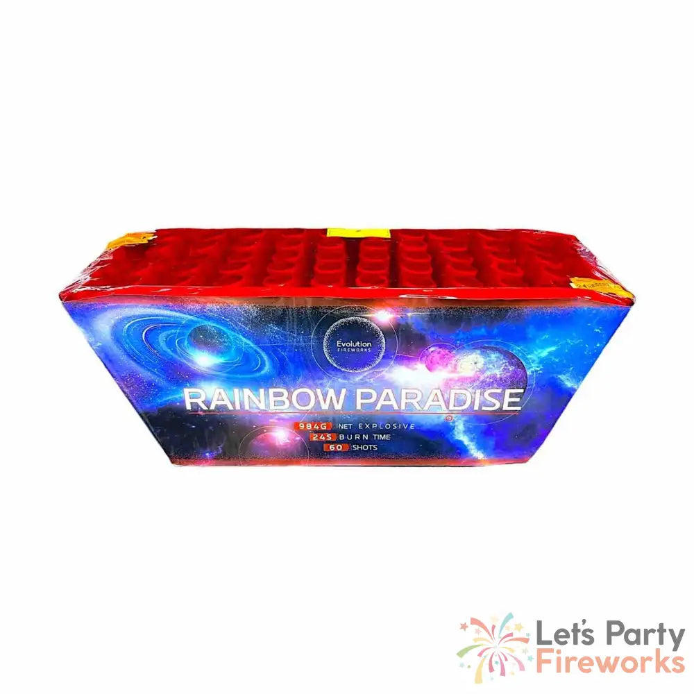 Rainbow Paradise is a brilliant 60 shot masterpiece of a firework , this mesmerising single ignition firework is in a class of its own ,with its colourful mine lifts then up into sky followed by all the colours of the rainbow with beautiful coloured peonies , this is a class of a firework.